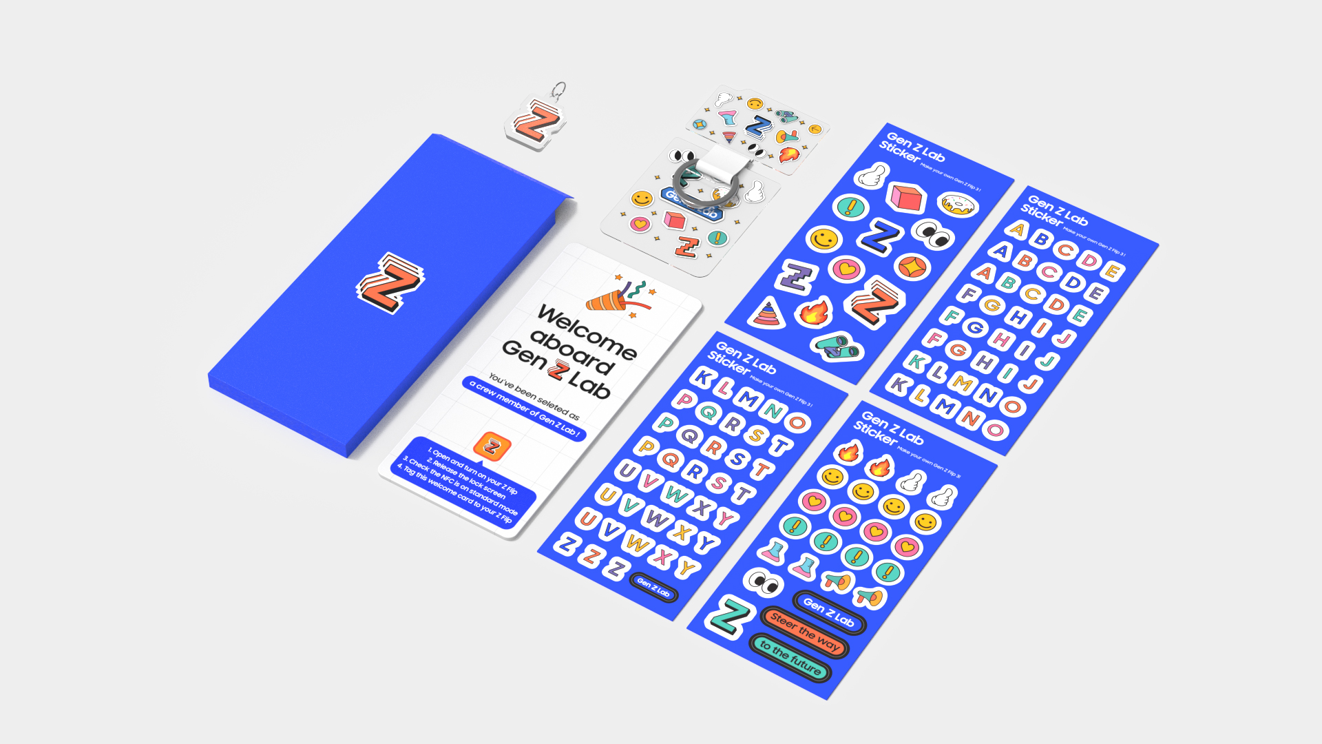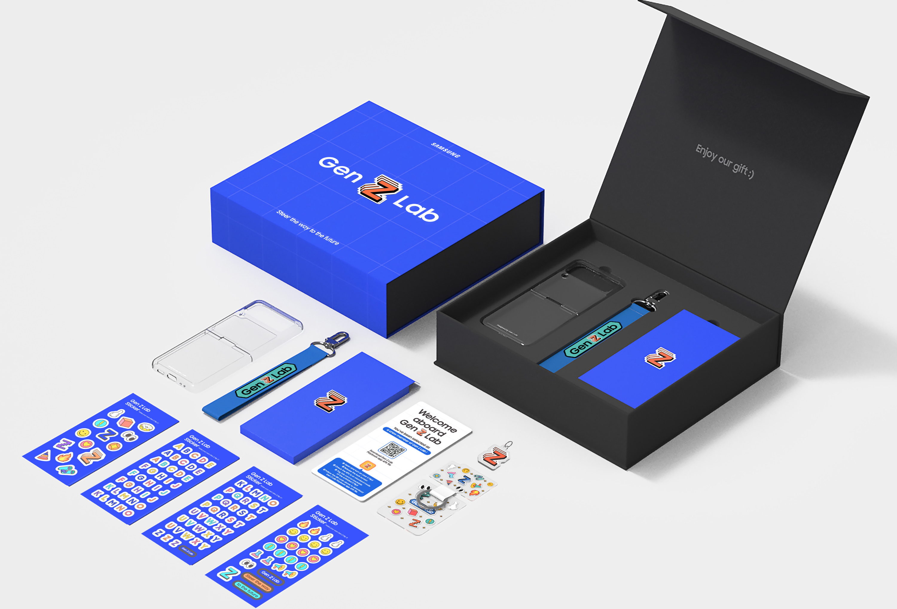 젠지랩(현 Future Generation Lab)은 Z세대를 중심으로 전 세계적으로 영향력 있는 인플루언서들을 선발해 그들을 주축으로 삼성의 비전을 전달하고 영향력을 확장해 나가기 위해 만들어진 팀입니다. 호호호에서 는 젠지랩의 비주얼 아이덴티티 및 그래픽 어셋을 디자인하고, 그것을 바탕으로 젠지랩 멤버들을 위한 웰컴패키지 (Z Flip3 케이스, 팔레트, 스 트랩, 키링, 스티커, 웰컴카드)를 제작했습니다. 또한 웰컴카드를 태깅하여 다운로드 할 수 있는 젠지랩의 갤럭시 테마와 젠지랩 멤버들의 교육을 위한 108페이지 분량의 플레이북을 앱과 파워포인트 두 버전으로 디자인해 멤버들에게 배포했습니다. 현재는 Future Generation Lab이라는 이름으로 변경되어 활동하고 있습니다.